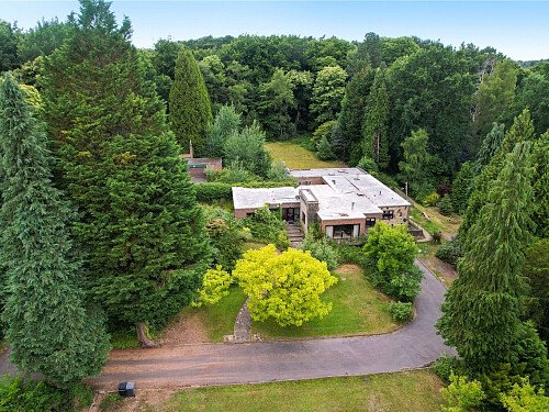 1965 built, single storey, long low unusual building, large windows, one unmodernised 2 bedroom/one semi-modernised (3 bedroom), 10 acres private land including woodland. Adjoining buildings and outbuildings.